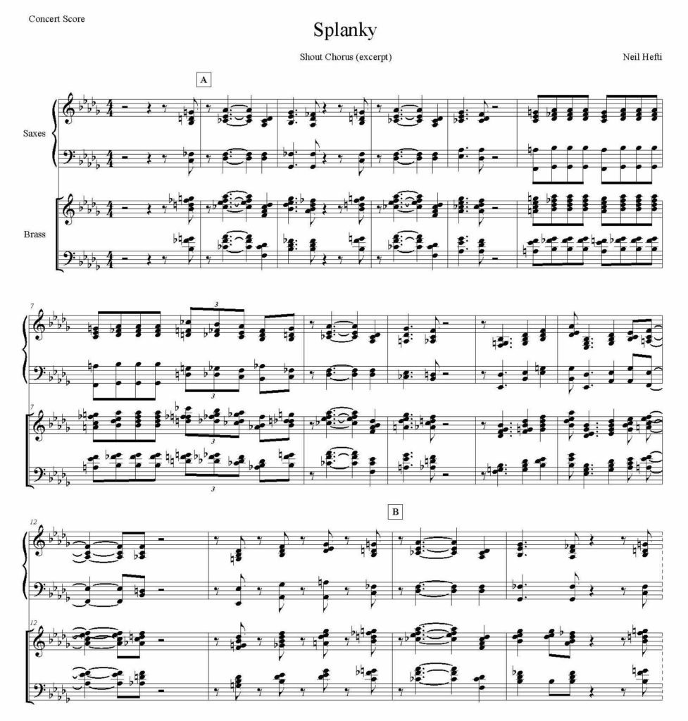 Shout chorus from “Splanky” composed for the Count Basie Band and is recorded on “The Atomic Mr. Basie”. Demonstrates ‘triple lead’ orchestration. Lead trumpet, alto saxophone and trombone are doubled at the octave.