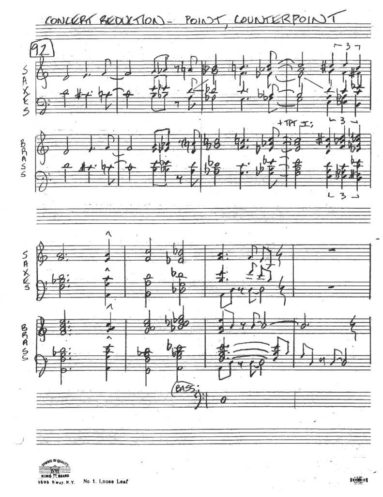 We must always remember that, as arrangers, we’re subservient to the melody and must write accordingly. Unlike composers, we arrangers are not allowed the luxury of personal likes and dislikes when it comes to the melody or the musical style we have to work in. Disdain for a certain style or song shows through in your musical arrangement. (The hardest job I ever had was when Count Basie asked me to arrange Rubenstein’s “Melody In F” for his band. I didn’t care for the song as a Basie-style tune, and I stared at blank score pages for weeks.) We have to divorce ourselves from our musical prejudices, listen to all kinds of music, and be prepared to cover any style with sincerity. Remember what Hank Mancini said – “regardless of one’s personal feelings.”