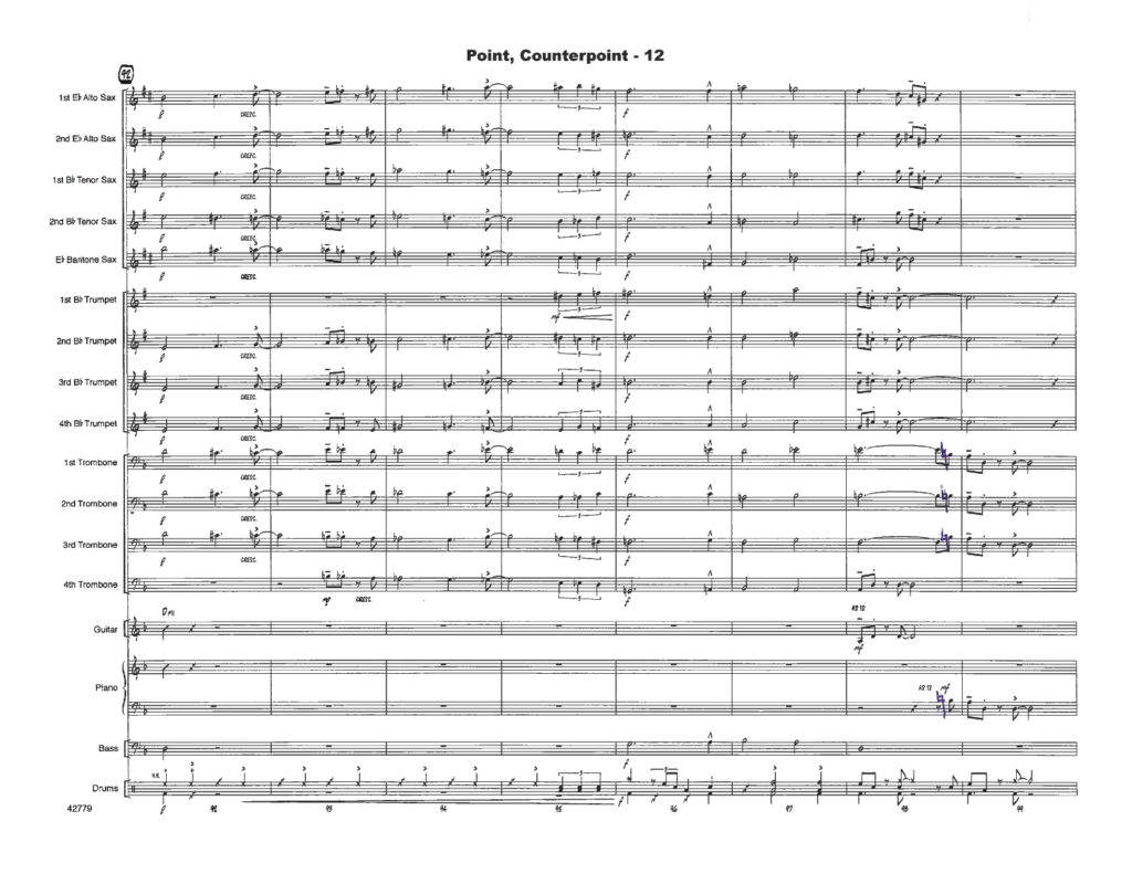 So the trick then becomes to maintain as high a level of harmonic and rhythmic sophistication possible while still keeping it playable. I firmly believe that you can still add alterations to your voicings or have an interesting progression; you just have to create individual lines for the players that are technically manageable, range-appropriate and that voice lead well.