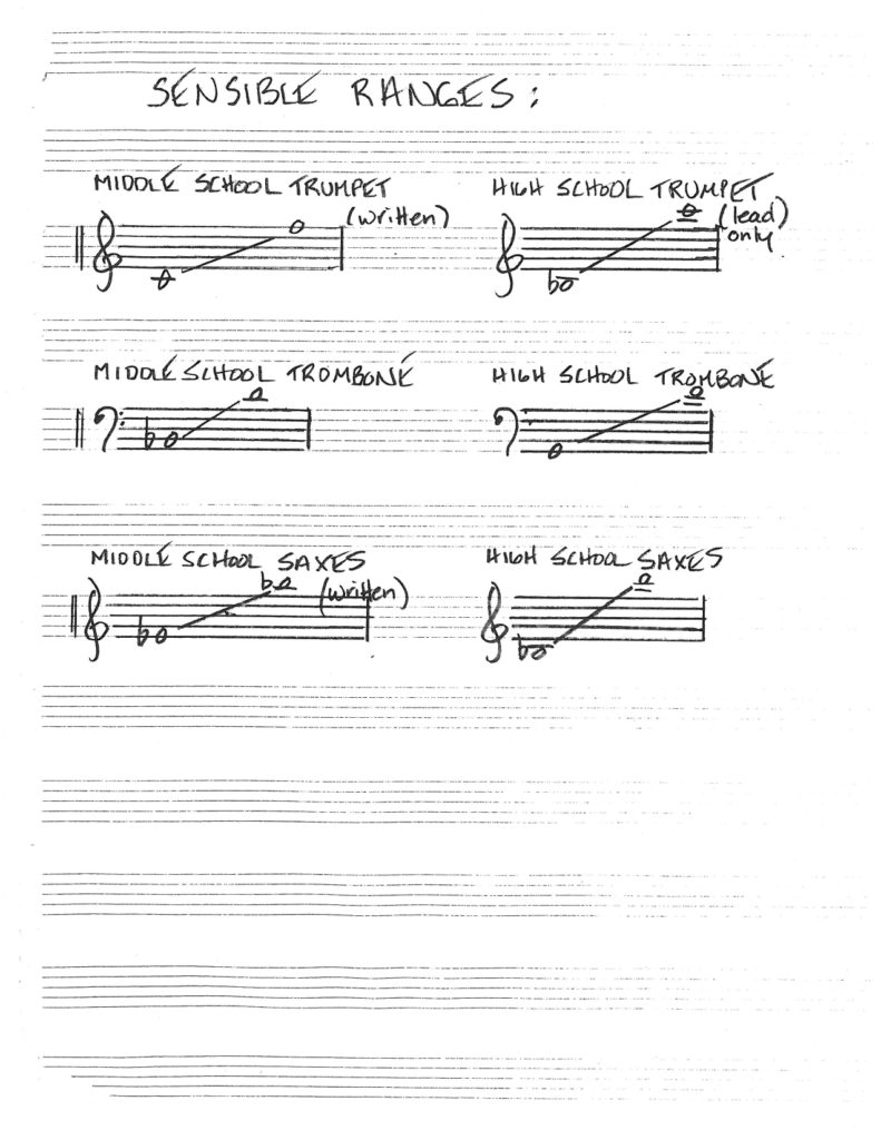 Most of us spend our time studying the art of composition and arranging with the ultimate goal of writing for professional bands, either our own groups, top level university groups, military jazz ensembles and the like. Writing for groups likes these allows us to write challenging music, replete with woodwind doubles, all kinds of mutes, odd meters, no seriously limiting range constraints or technical considerations and the possibility of highly complex changes to improvise over. While these pieces can be published and sold off of our own websites or possibly through existing publishers, if they are willing to take on pro level material, there is also a world out there of elementary, junior high and high school jazz bands who also desperately need to be exposed to good literature. There are certainly many age-appropriate well-written pieces out there already, but I’m writing this in the hopes of encouraging more professional composers, especially younger ones, to think about taking on the challenge of writing unique and compelling music for developing players that may provide them inspiration to continue on in this music.