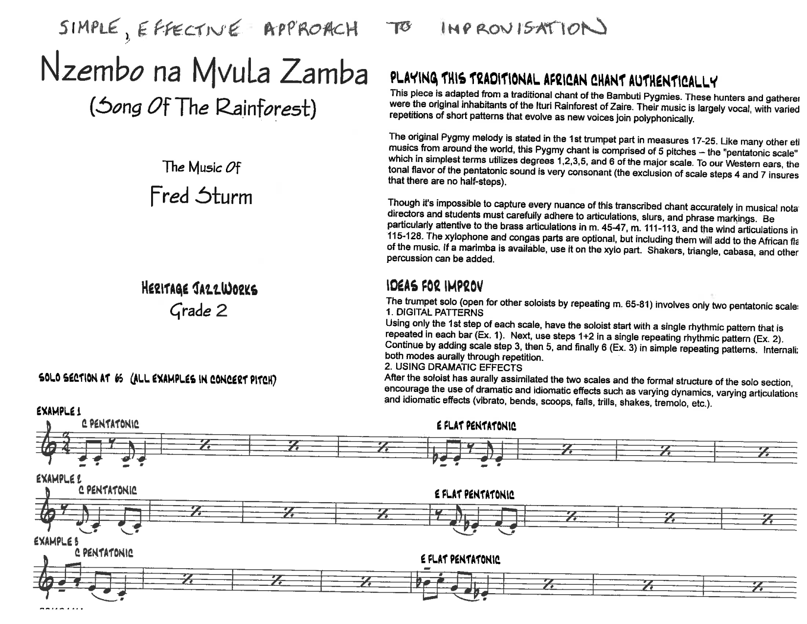 One of the composers that I most admire for his ability to write interesting and fun music that never sounds “dumbed down” is the late, great Fred Sturm. I have used two of his pieces in presentations to show how the goals mentioned above can be achieved:“Song of The Rainforest” and “Another Step Towards The Blues”.